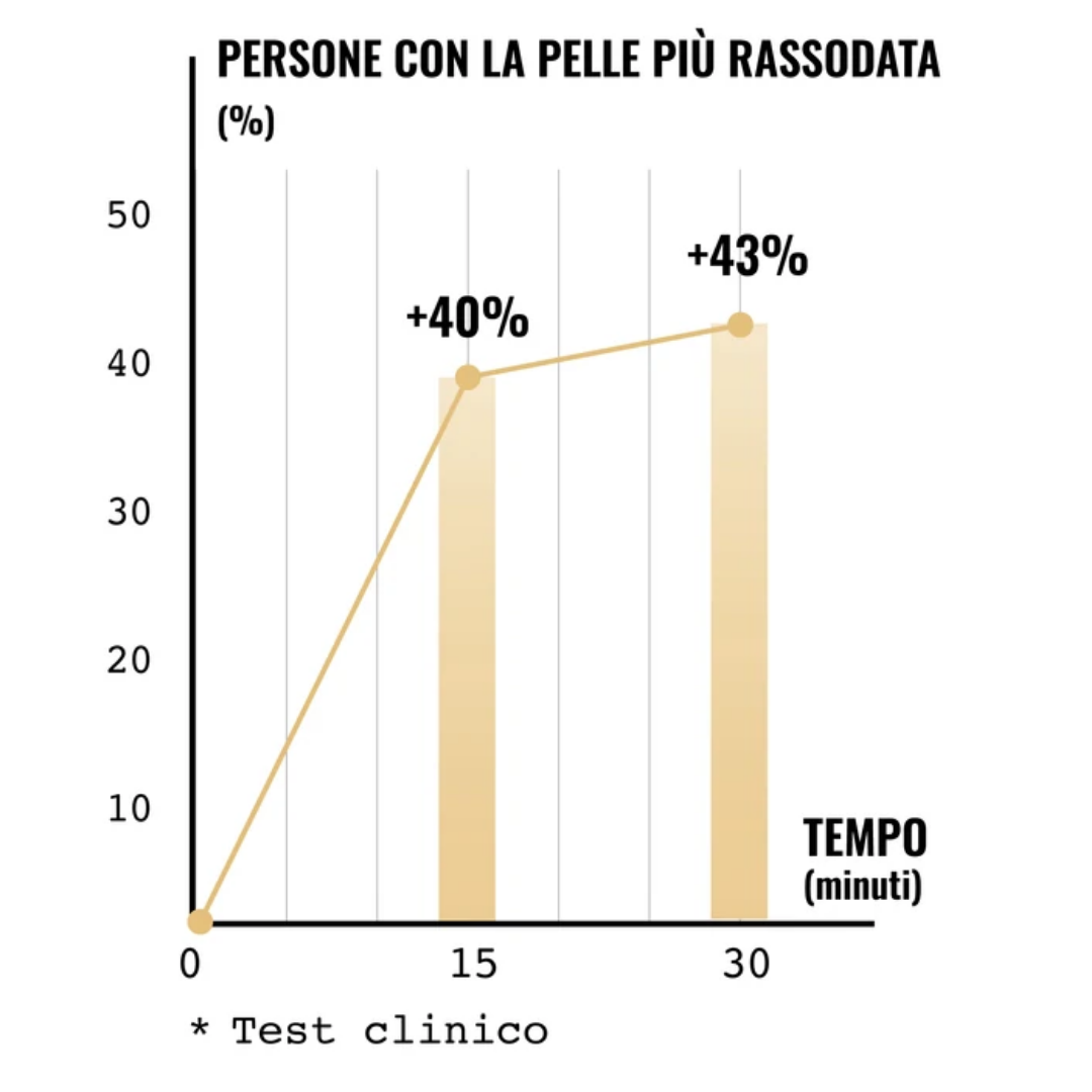 Grazie all'azione liftante antigravità dell'acido ialuronico e alle proprieta' tonificanti del GIN SENG, si riesce ad ottenere una pelle fino al 47% più tonica e rassodata rispetto ai classici prodotti da banco.